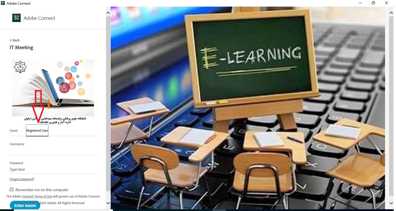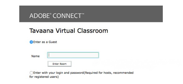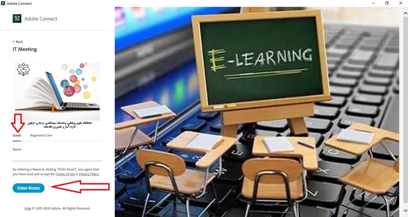 سپس از شما خواسته میشود تا اگر حساب کاربری در کلاس دارید، یوزرنیم و پسورد خود را وارد کنید، در غیر این صورت گزینه Enter as a Guest را انتخاب کنید، نام کاربری برای خود تعریف کنید و در کادر مقابل Name، نام را وارد کنید و سپس گزینه Enter Roomرا بزنید.