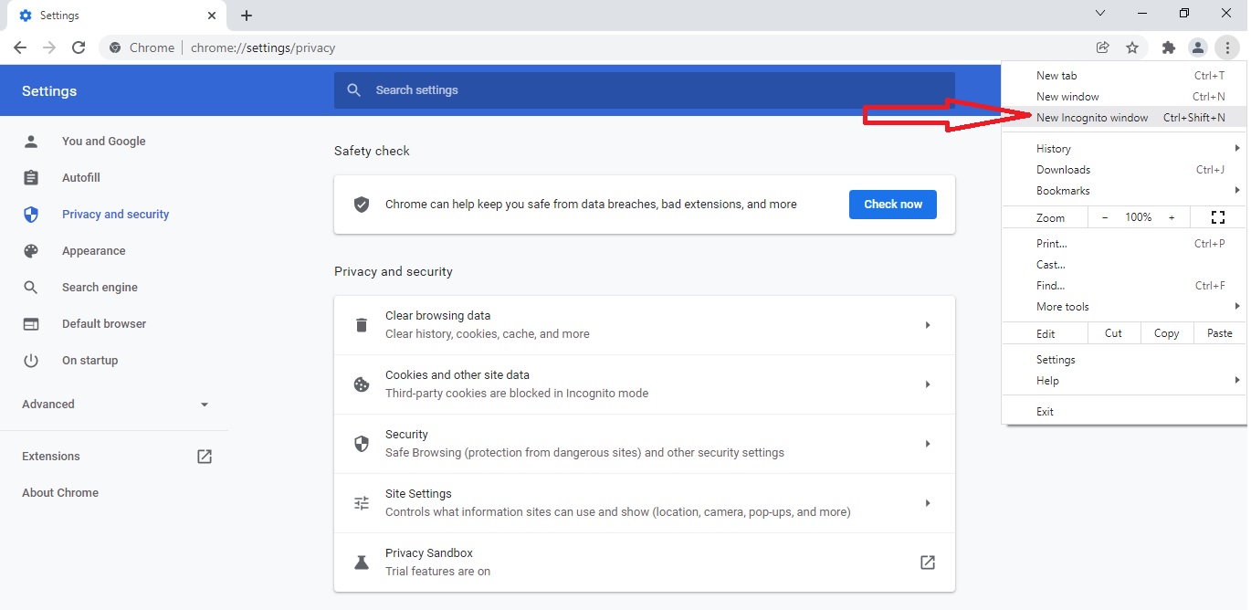 در این روش بهتر است که مرورگر خود را در حالت pravite اجرا کنیدکه برای اجرای مرورگر درحالت praviteگزینه متفاوتی در مرورگرهای مختلفی پیش روی شماست، در مرورگر کروم برروی آیکون سه نقطه عمودی در سمت راست وبالای مرورگر کلیک کنید و سپس برروی گزینه ی New Incognito Window کلیک کنید.