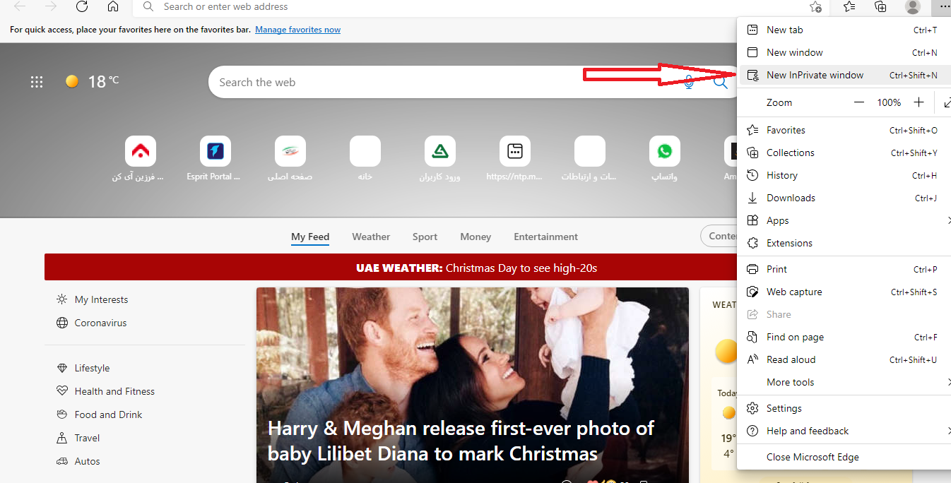 در مرورگرEdge روی سه نقطه افقی سمت راست بالای صفحه کلیک سپس برروی گزینه ی New Inpravite Window بزنید