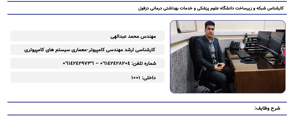 توسعه بستر مناسب جهت دسترسی به سرویس ها در هر زمان و هر مکان با توجه سیاست های دانشگاه امکان سنجی جهت توسعه بستر شبکه دانشگاه تهیه برنامه بازدید و بروزرسانی تجهیزات بهینه سازی شبکه جهت افزایش رضایت کاربران ارتقای سرعت و پایداری شبکه مراکز تابعه با توجه به طرح توسعه تامین زیرساخت مناسب جهت راه اندازی نرم افزارهای مورد نیاز دانشگاه تهیه و بروزرسانی مستندات شبکه و زیرساخت دانشگاه و معاونت های تابعه نظارت بر راه اندازی و بهینه سازی شبکه LAN و WAN معاونت های تابعه دانشگاه توسعه و نگهداری زیرساخت مرکز داده راه اندازی و نگهداری زیرساخت مجازی سازی سرورها در مرکز داده راه اندازی و نگهداری سرورهای لینوکسی و ویندوزی مرکز داده راه اندازی و نگهداری سرورهای مانیتورنگ مرکز داده پایش و کنترل شبکه با استفاده از ابزارهای مانیتورینگ و مدیریت شبکه نظارت فنی و همیشگی روی عملکرد صحیح تجهیزات شبکه |