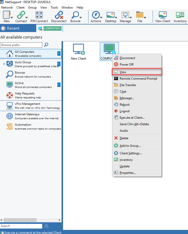 بعد از اتصال به کامپیوتر کلاینت، گزینه View  را کلیک می کنیم.