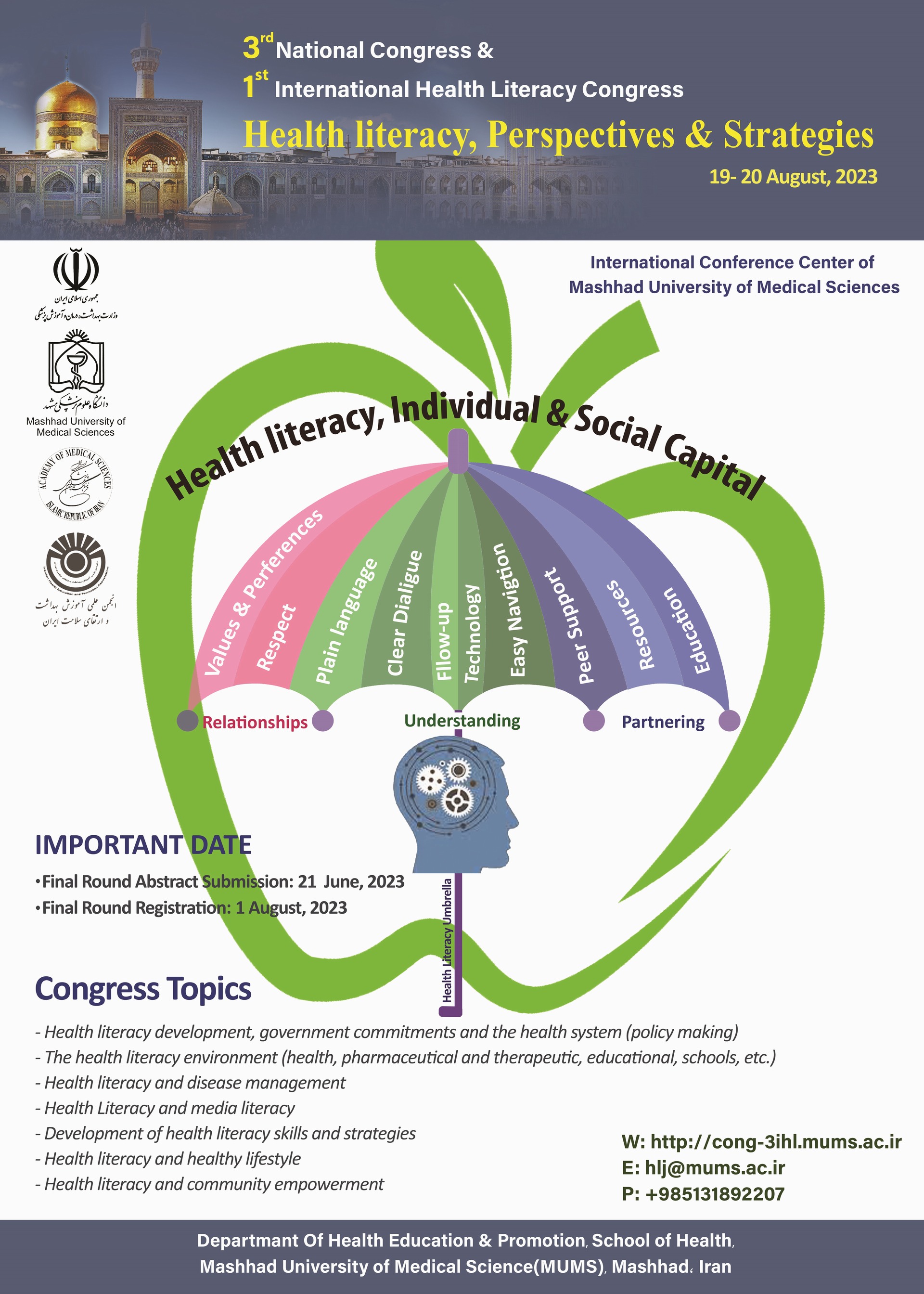 برگزاری اولین کنگره بین المللی و سومین همایش ملی سواد سلامت  که در تاریخ ۲۸ و ۲۹ مرداد ماه 1402 در مشهد مقدس برگزار می گردد. جهت کسب اطلاعات بیشتر به آدرس http://cong-3ihl.mums.ac.ir/fa/  مراجعه گردد.